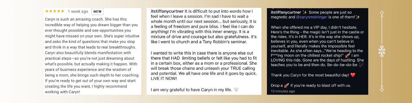 - A Private VIP Day after the event with Caryn to get a year of business therapy in just one afternoon of meeting your no-limits self (and yep, we can do it before the event)